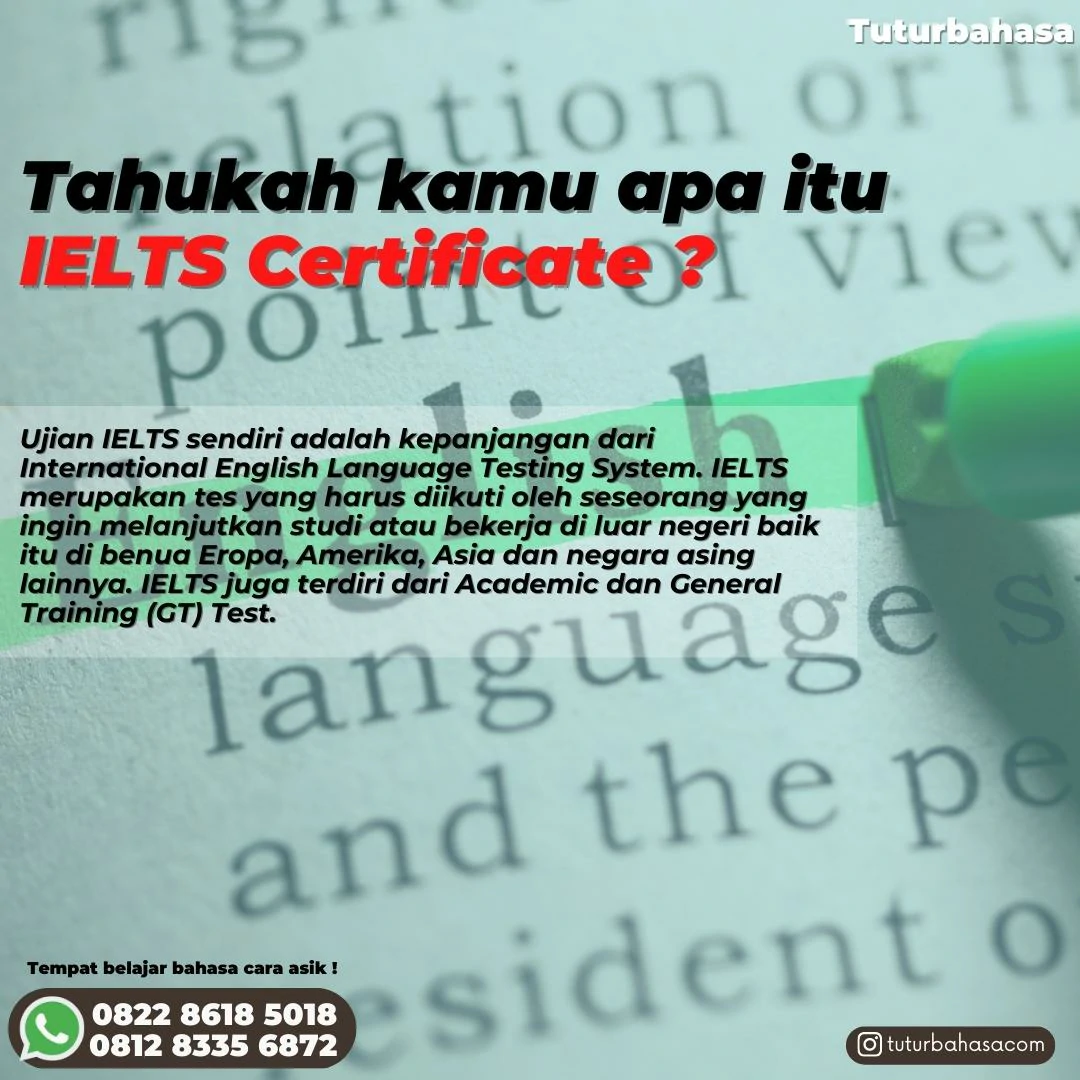 Ujian IELTS sendiri adalah kepanjangan dari International English Language Testing System. IELTS merupakan tes yang harus diikuti oleh seseorang yang ingin melanjutkan studi atau bekerja di luar negeri baik itu di benua Eropa, Amerika, Asia, dan negara asing lainnya. Ujian IELTS terdiri dari Academic dan General Training (GT) Test.