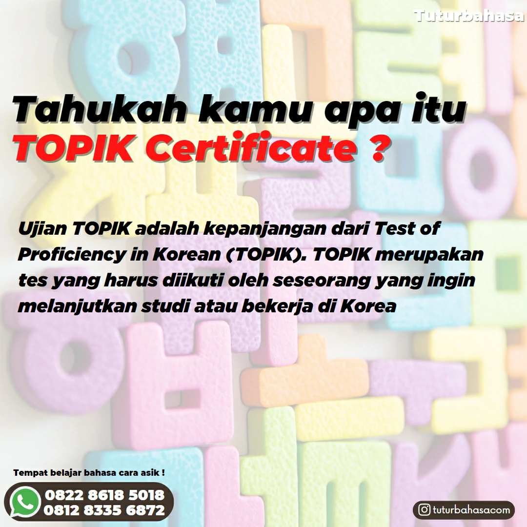 Ujian TOPIK adalah kepanjangan dari _Test of Proficiency in Korean (TOPIK). TOPIK merupakan tes yang harus diikuti oleh seseorang yang ingin melanjutkan studi atau bekerja di Korea.